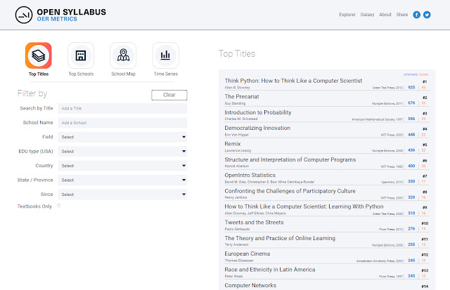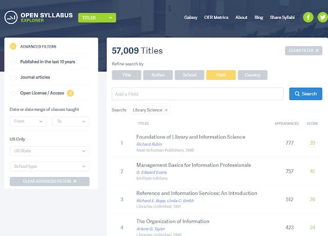 In 2017's "Can we assess library electronic resource usage with citations, altmetrics & more ?", I briefly mentioned Open Syllabus - which allows you to look at the top cited books or articles in syllabus around the world.
