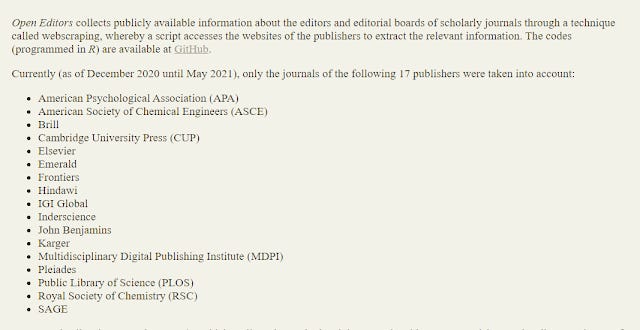 The current approach is based on a necessarily incomplete publisher and journal coverage. ..,. Even if one wished to limit oneself to the largest publishers, their heterogeneous way of displaying data about editors inhibits a simple webscraping approach. Examples include Springer, Oxford University Press, Taylor & Francis, and Wiley