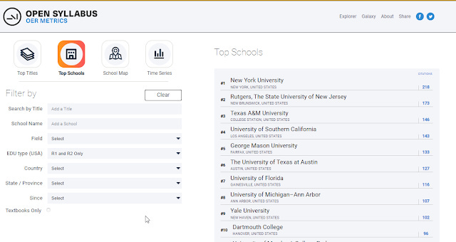 Besides the obvious use of looking for particular OER sources that are commonly used by field, country or even particular school, you can also click on Top schools, to see which schools have syllabus that assign the most OER.