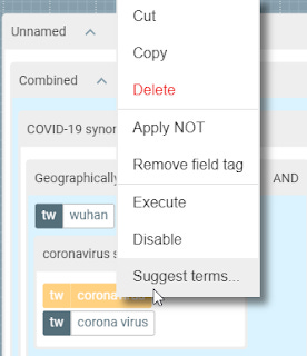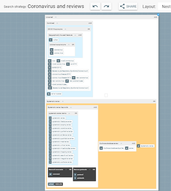 Besides creating shareable links to the visualizations you can of course save the queries. I decided to try to combine the strategy strategy for finding systematic reviews with documents on COVID-19.
