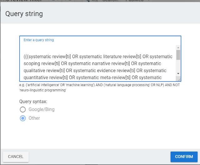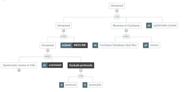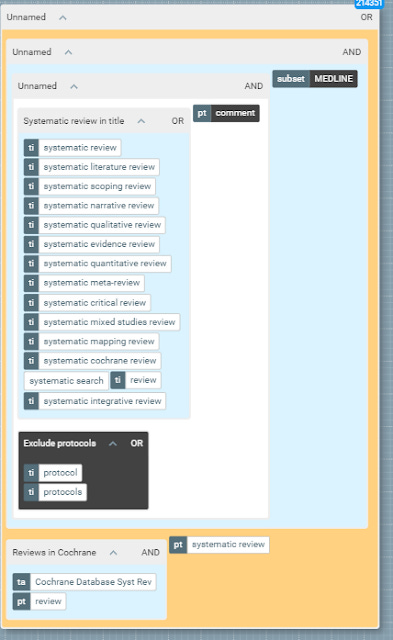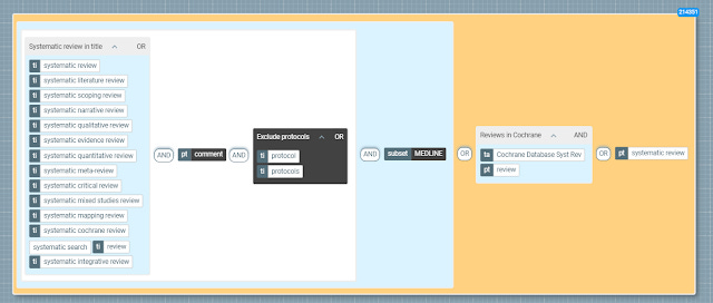 Librarians trained to do systematic review will find the search strategy above laughably simple (e.g. you could extend it further by extending the strategy to matches words like "review" in titles which increases recall at expense of precision). They deal with far more complicated queries such as this filter for cancer.