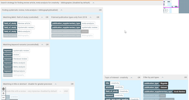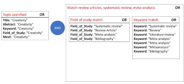 Clearly you can see the small block on the left is meant to match documents of the topic in question ("Creativity" is the topic but you can replace with any topic of interest), while the block on the right is to match items that are systematic reviews, review articles, meta-analysis and bibliographies.