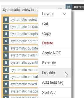 For example, you might want to check the effect the block that is matching titles for words like systematic review has on the results. So you can click right click disable it and look at the number of results and compare with it enabled. You can of course re-enable it again. If you find adding a certain block has no effect on number of results, you might not want to include it to simplify the search.
