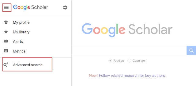 Click the down arrow button to get access to advanced search in the old Google Scholar