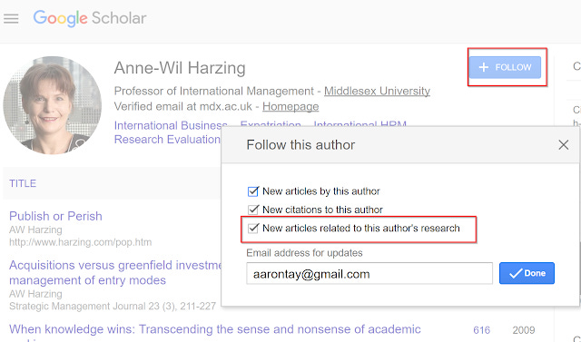 Follow Harzing profile to get recommended articles similar to her research publications in Google Scholar