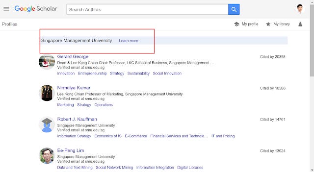 Another fairly new feature in Google Scholar citations is that they now try to group together authors by institutions. So for example when you search for the name of an institution in Google Scholar, you get something like this.