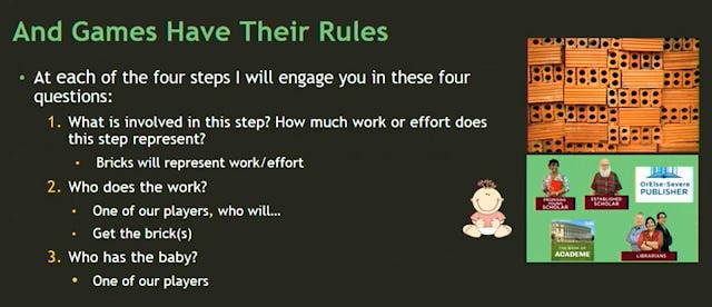 The advantage of this game is that it can work with relatively large audiences and unlike games like the Publishing Trap which while realistic may be considered a bit juvenile for established faculty, the point this game makes on the flow of money can be effectively used at events like Faculty meetings etc.