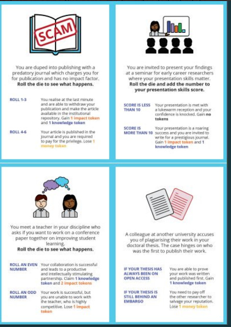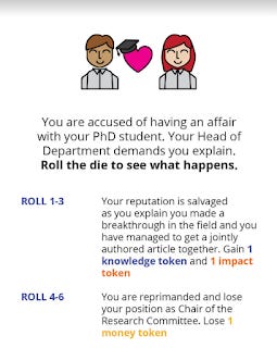 What I love about this game is it's feel quite real. It's almost like The Game of Life boardgame. I remember playing as a child but for researchers and faculty, covering some common and some not so common situations you might face.