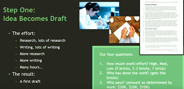 Audience may decide this is High work/effort = 5 bricks. They then decide say the work is mostly done by the promising young scholar and assign 4 bricks to her and a bit of effort is from the established Scholar and the presenter places 1 brick for that player.