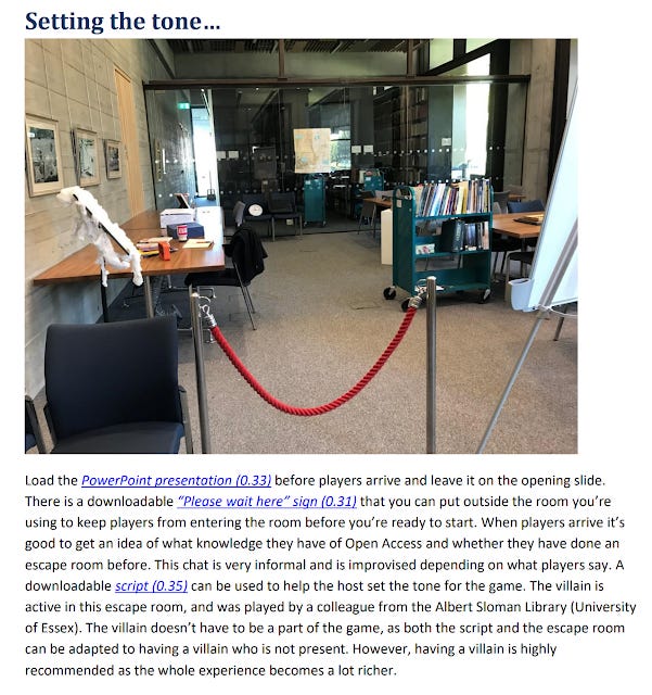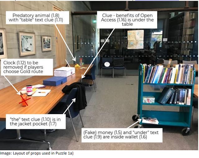 The author of the game Katrine Sundsbø just published an article - Open Access Escape Room: the key to OA engagement? which provides more insights into the game. The paper describes the motivation for creating the game , how it was tested and the experiences running it at the University of Essex during Open Access Week 2018, followed by another run for early career researchers in Jan 2019. From the article it seems the game is pitched at just the right level of difficulty where everyone is likely to finish the game in a reasonable time (50 minutes was mentioned) but there are provisions for the presenters to give hints if the players are stuck.