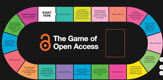 Jeu de l'OA by Lilliad, the library of the University of Lille, Sciences and Technology - "a goose game designed to help showcasing open access and topics related to open science (data preservation and dissemination; copyright issues...) to Phd students and researchers."