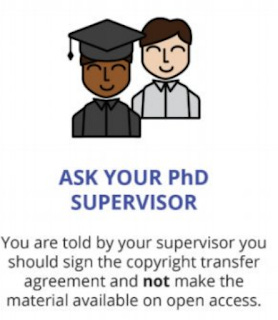 So for example, one of your earlier choices as a newly graduated Phd student is to decide if you want to embargo your thesis or not and you can choose to ask your Phd supervisor for advise or attend a class by a librarian.