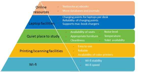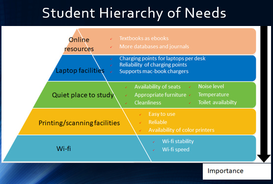 Of course, Maslow's doesnt quite fit, as students can easily want say "Quiet place to study" without needing "Printing/scanning facilities", but I would argue in fact this hierachy of needs typically makes sense.