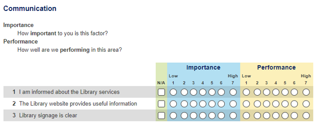 For each item, they are asked to rate an "importance" and a "performance" score from 1-7.