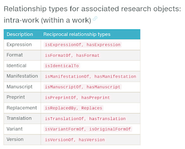 Technical Note : Here I describe what Crossref calls typed relationships. There are other ways to express relationships using Crossref DOIs , including via references lists or using specific Crossref services like Crossmark, and Cited-by services. The main advantage of using typed relationships is that it works for creating relationships beyond just to Crossref DOIs but also other DOIs and identifers. Datacite in particularly uses the same type of linking which is handy for data citations