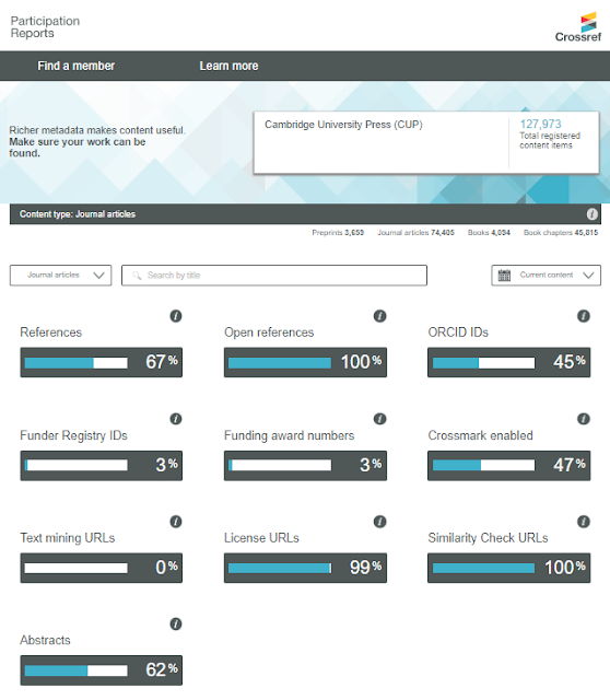 Below shows a sample Participation report for a Crossref member - Cambridge University Press (CUP)