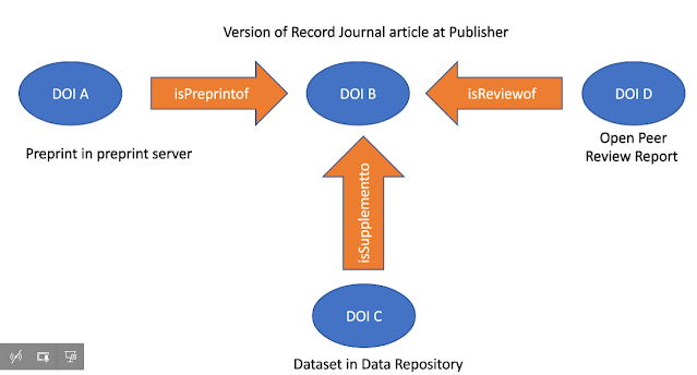 So for example, a DOI for a preprint could be linked to another DOI for the published version of record DOI which a isPreprintof relationship.