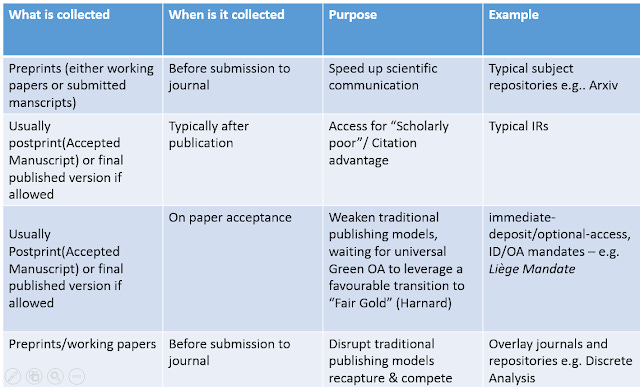 Reading Richard Poynder's somewhat disputed recounting of history of what was to be the first OAI conference at Santa Fe, New Mexico in 2009, I finally realized that while subject repositories and institutional repositories both could collect preprints/postprints the two were very different in terms of timing of deposit and reason for deposit.