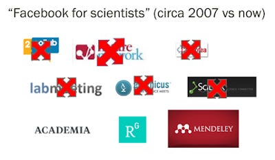 As I noted in a talk recently, academic social networks like ResearchGate are not new, and there were a flood of them in 2007-2009, including now defunct attempts by Elsevier and Nature.