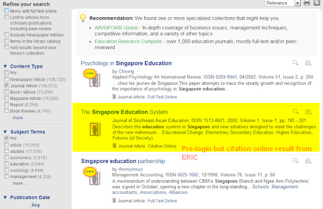 The above shows an example of a "Citation online" result from ERIC database in Summon pre-login. In general such examples are rare as most A&Is, do not allow display of their data without authentication.