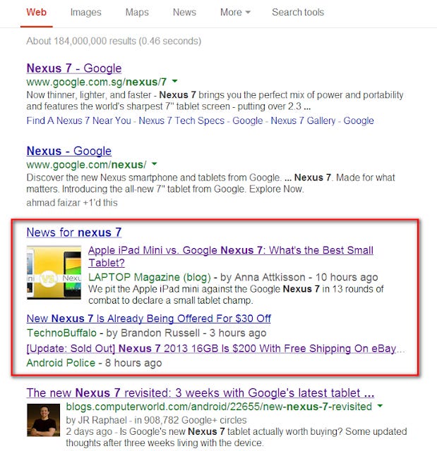 This draws inspiration I believe from how Google sometimes embeds results from Google News into a web search. Below shows our a web search for "Nexus 7" gets you mostly web pages but in the 3rd result, you see results from Google news.