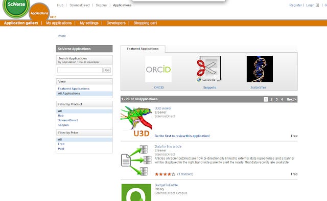 The above shows the Sciverse application gallery, where you can shop for apps you want to use with Scopus and Sciencedirect.