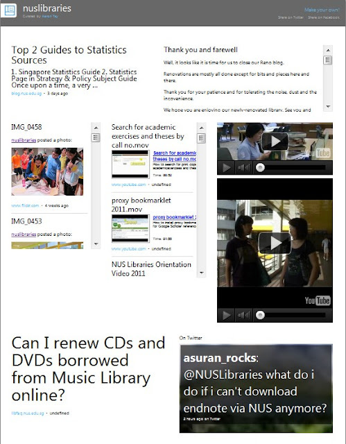 The number of options are quite varied, you can add flickr, youtube, blogs via RSS feeds or add Twitter (keyword or Timeline) in various styles (list vs Slideshow, animation direction etc). In the example below, I have sources from the library YouTube, Flickr, Twitter, LibAnswers RSS and various blogs.