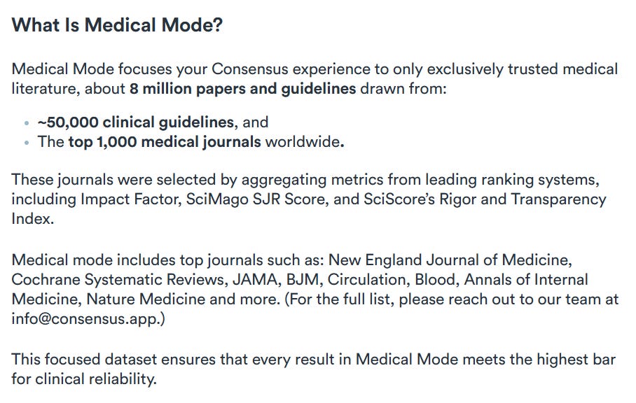 3. Publication Bias Blindness: Published literature systematically overrepresents positive findings. Consensus search of 200M+ index including preprints helps reduce this but still it does not have the comprehensiveness of a properly done systematic review. A meter showing 80% of papers say “yes” might reflect publication bias rather than true consensus.