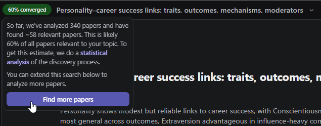 Undermind also provides a statistical analysis estimating how much relevant literature might remain undiscovered, though this feature lacks independent validation.