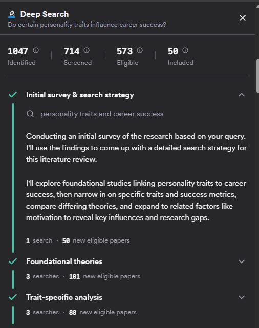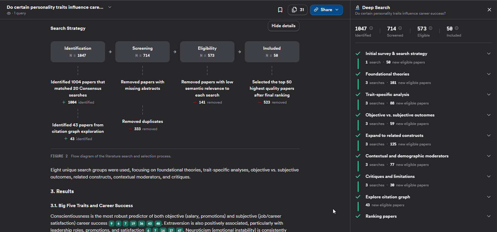 Consensus Deep Search, introduced fairly recently, is its entry in this space. It is broadly comparable to Undermind.ai and, to a lesser extent, Elicit’s “Research Report” / systematic review flows. Both Undermind and Consensus typically finish in under 10 minutes; in my experience, Consensus is slightly faster.
