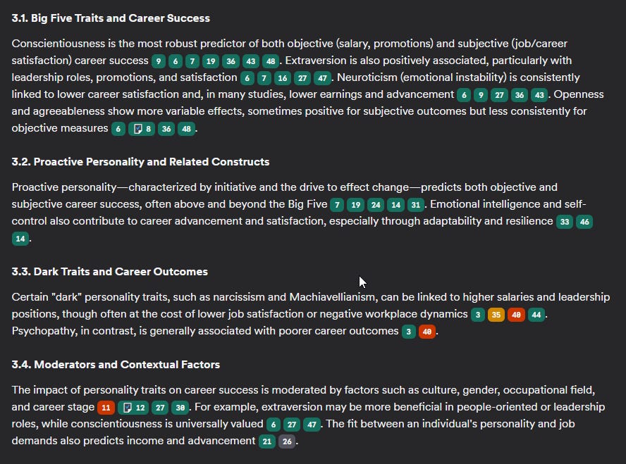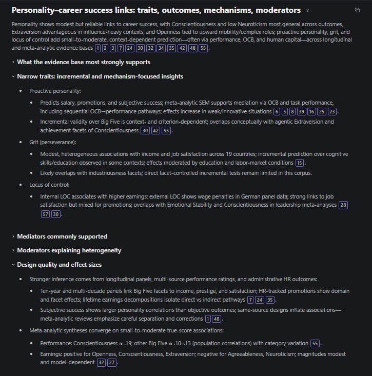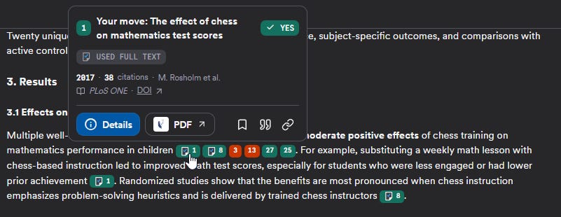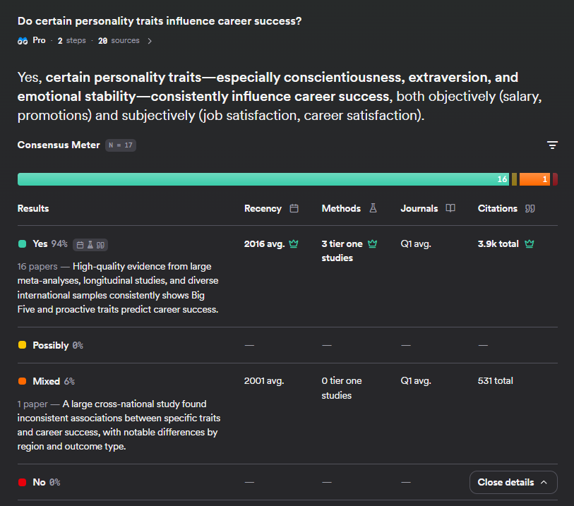 Still, I have some misgivings over how STEM centric some parts of Consensus are, for example there’s it’s use of SciScore, details extracted for study snapshots etc. While the sources are broad enough, one wonders if the tool works better (e.g. retrieval and ranking algo is tuned) for STEM subjects.