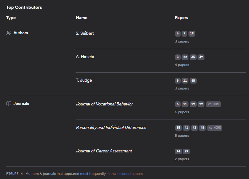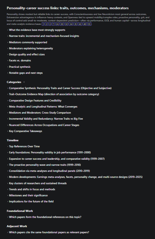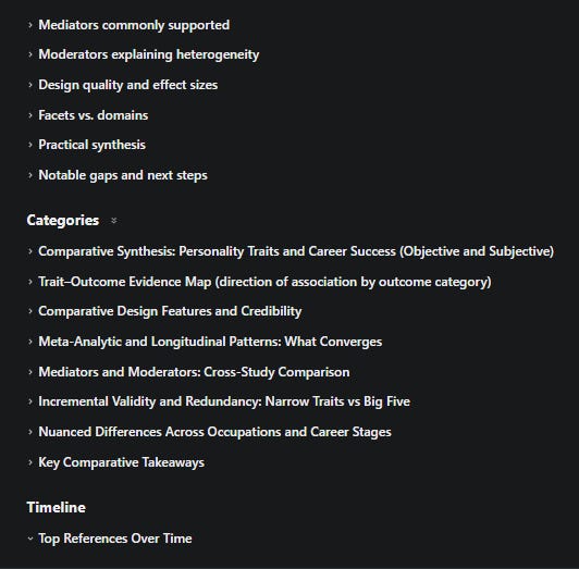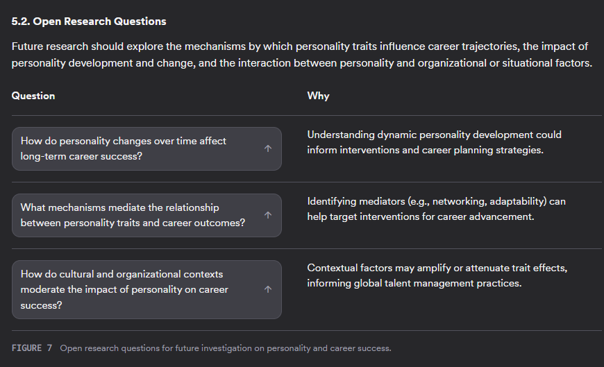 Besides the standard sections in Undermind, the subsections under it are more variable but typically you will see coverage of areas like “research gap”, “cluster of top authors” etc, pretty much what you see in Scopus AI, Consensus Deep Search etc.