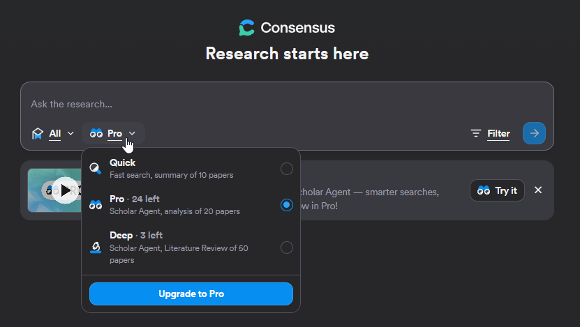As of this writing, Consensus has announced “Scholar Agent“ in collaboration with OpenAI, deployed in “Pro” and “Deep” modes (we will discuss this later). This means Consensus now uses GPT-5 through the response API, with specialized planning, search, and reading agents working together (see post for flow diagram).