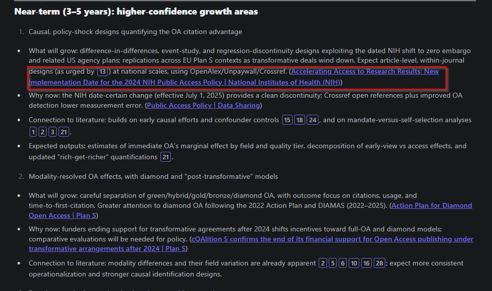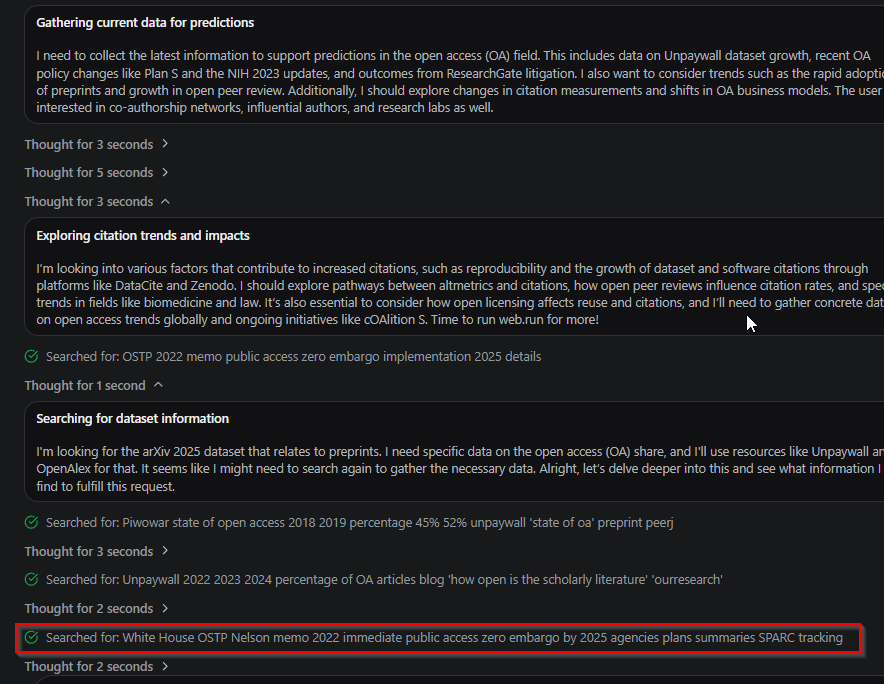 Interestingly, earlier versions of this feature would independently search the web when using default prompts to supplement academic sources with government reports and policy documents. It almost never does this now, but you can turn this on by explicitly adding “Search the web” to the default prompts. As you can see below, the LLM is searching the general web for general US policy on open access.