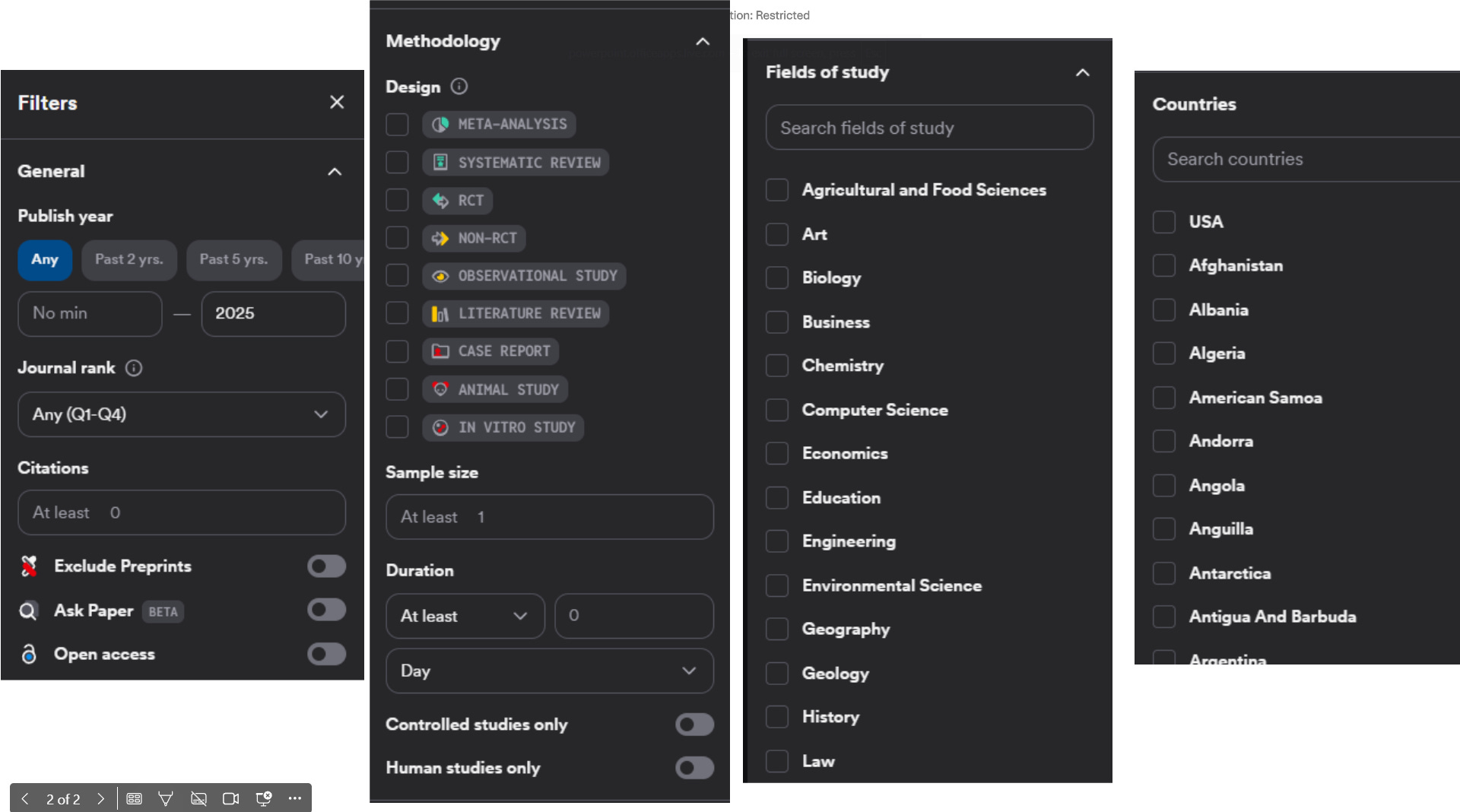 The one area regarding search where Consensus maintains a clear search advantage is its extensive pre-filtering options, allowing users to exclude preprints or filter by journal quality thresholds before conducting searches.