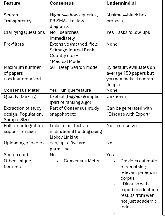 These are not deal-breakers, but they highlight that while Consensus is more transparent than Undermind, it’s still not meeting the standards of reproducibility required for formal systematic reviews. Like Undermind and the other tools in this class, it is best thought of as a sophisticated scoping or exploratory tool rather than a replacement for systematic review methodology.