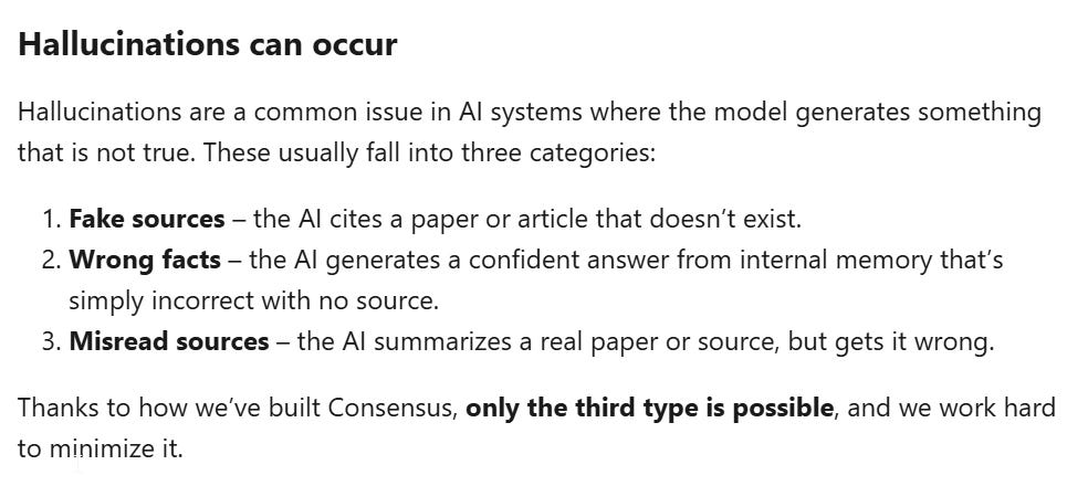 Consensus claims to be immune to hallucinations that involve non-existent references, and not to answer from “internal memory” without sources. In my testing, it did indeed refuse where it should.