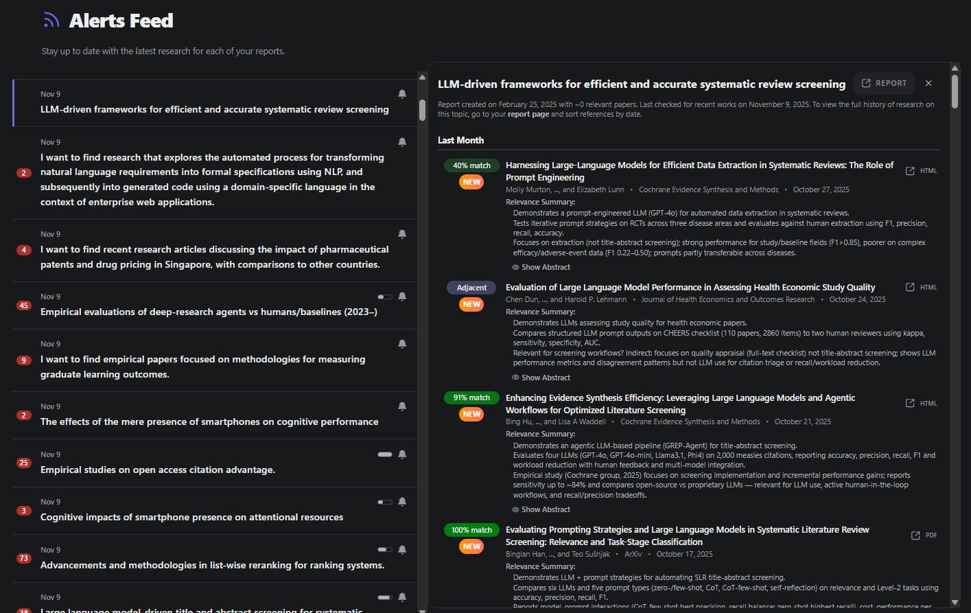 Another valuable feature is Undermind’s search alerts based on created reports, which the author finds extremely high-quality and useful, including “adjacent” alerts that surface related but not directly requested content—something Consensus doesn’t currently offer.