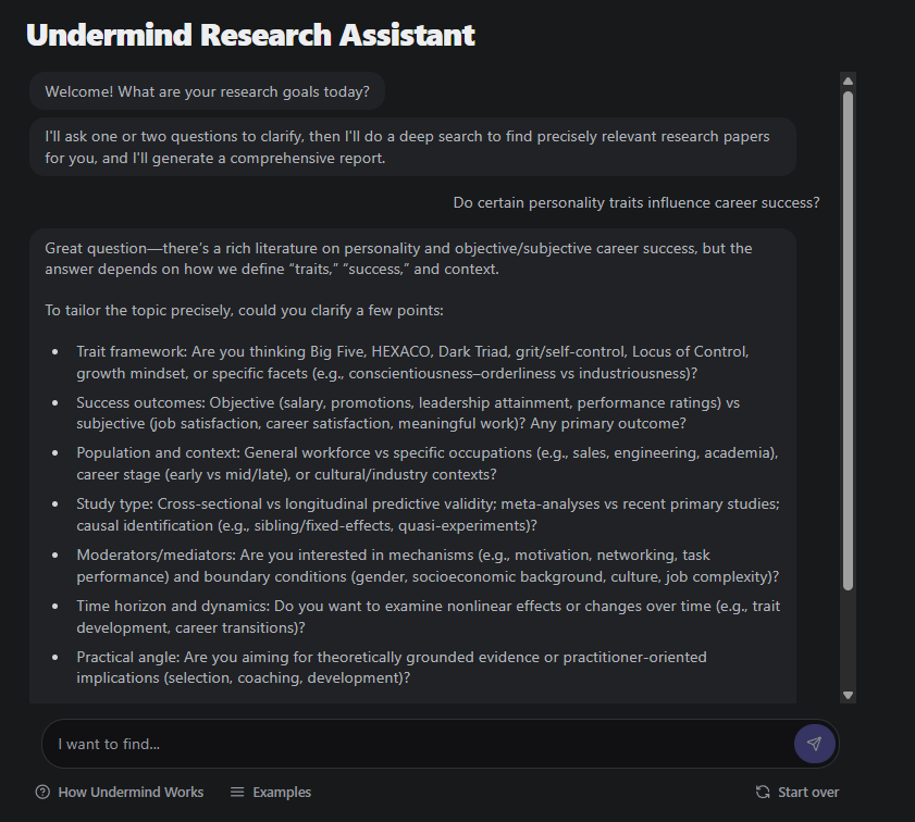 Some users find Undermind’s questions annoying; others (myself included) think they meaningfully improve search quality when you’re new to an area.