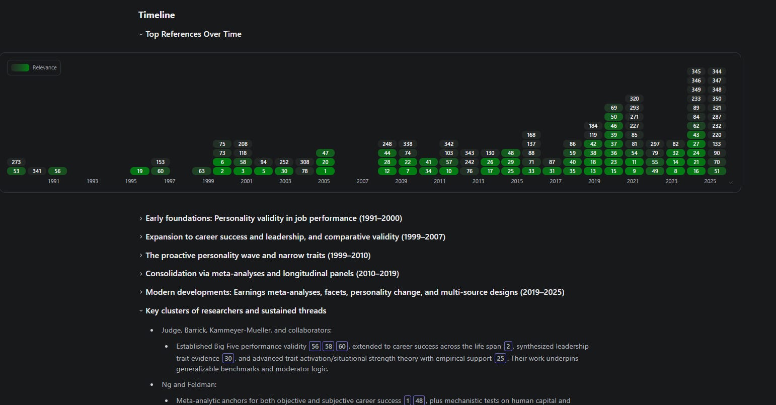 Results Timeline: Shows distribution of relevant papers over time—useful for identifying emerging trends or seminal early work.