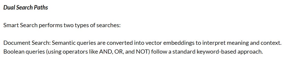 The examples at the end of the detailed support pages don’t clarify it for me either. I can’t tell if the semantic part is just LLMs (or some other “AI” NLP parser) helping to generate a Boolean search query or if this is just the Boolean part and the Semantic part is using embeddings to match.