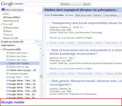 In this rather long post, I will talk about the different sources one could add to stay on top of one's research area. These include RSS feeds from traditional databases (citation alerts, table of contents of favourite journals), library opac feeds of searches and new additions, book vendor sites (e.g Amazon) book sharing sites (e.g LibraryThing), social bookmarking sites both generic (e.g. Delicious) and research 2.0 sites (e.g. citeulike), Google alerts and more