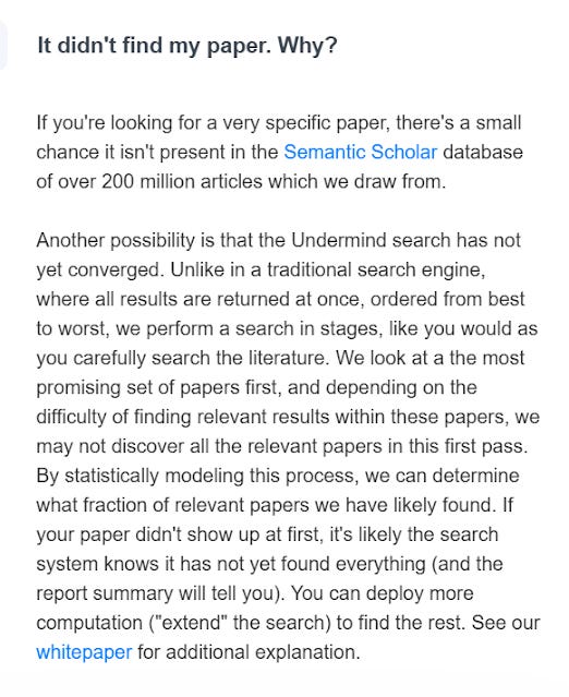 I have seen some users attempting to enter the inclusion citeria of systematic reviews into Undermind. While others throw in the actual boolean strings used in systematic reviews and ask for papers matching these strings! My guts tells me the later shouldn't work well, but to my surprise.....