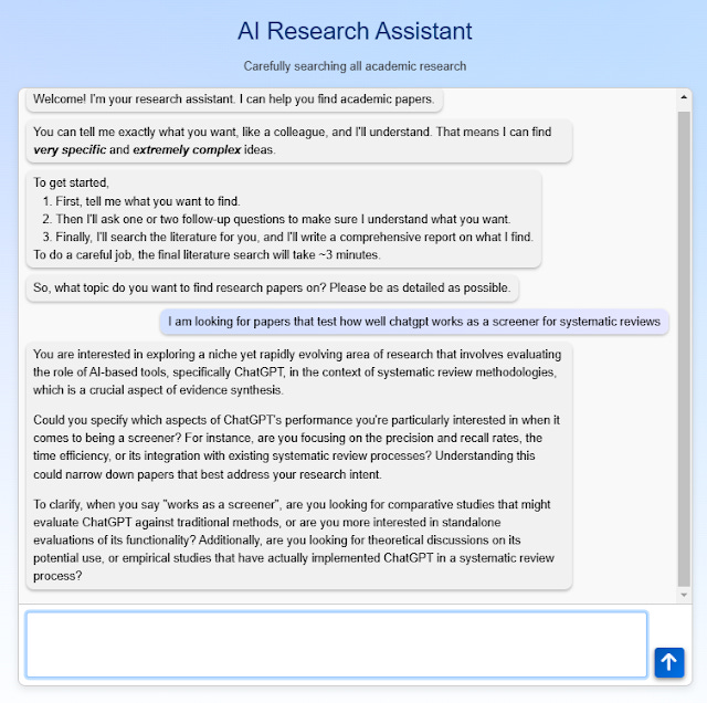 The thing is I think Undermind.ai does a great job of guiding users on what to do. For example, it states upfront that you are supposed to be very specific and brilliantly uses GPT4 to ask follow up questions to try to guide the user to be more specific. Because GPT4 has quite broad general knowledge of most areas of research, it's comments can even help user use terms that they may not have thought of!