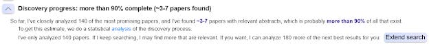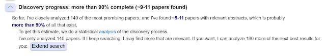 In the example above, it checked 140 papers, of which it estimate roughly 9-11 that are relevant. It thinks there are still another 10% more relevant papers that could potentially be found if you extend the search further.