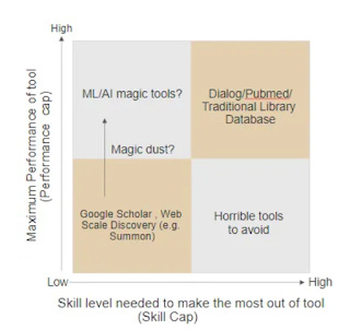 Trade-off: Tools like Google Scholar and Web Scale Discovery services (e.g., Primo, Summon) are seen as low skill and low performance cap tools—simple to use but limited in delivering high-quality results, especially for complex research needs. While PubMed and A&I databases are seen as the opposite, high skill but high performance cap tools.
