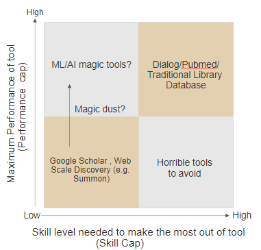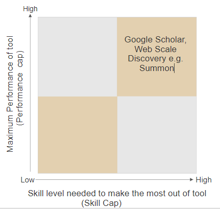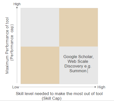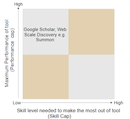 I am of the view that Google/Google Scholar and our Web Scale Discovery tools e.g. Summon are low skill cap but low performance cap tools as well. (Note: Some may disagree above the low performance cap bit if it meets their needs, so to a degree this is subjective)