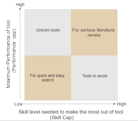 Ideally, we want to recommend and use search tools that are on the top left of the quadrant — Tools that have low skill cap (easy to use), yet potentially perform very well and avoid tools in the bottom right quadarant, crappy tools that take a ton of skill to use and yet don’t really perform well. In reality the top left quadrant of tools probably doesn’t exist hence I call them Unicorn tools and I’m sure any librarian can recall some crappy databases they would happily slot in the bottom right.