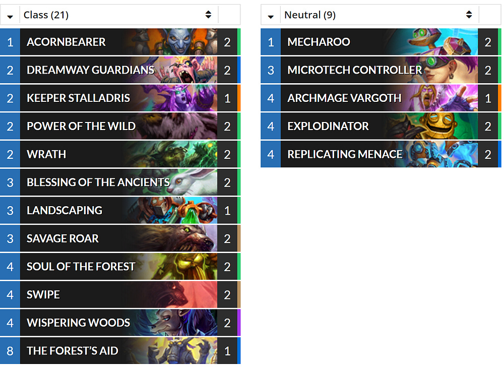 For example as I write this the straight forward to play ‘Token Druid” deck which has pretty much only a few lines of optimal play regardless of who you face has roughly the same win rate regardless of whether it is played at Legend ranks(Highest ranked players — roughly top 1% ), Rank 1–4 (next strongest players), Rank 5–10 (intermediate), Rank10–20 etc.