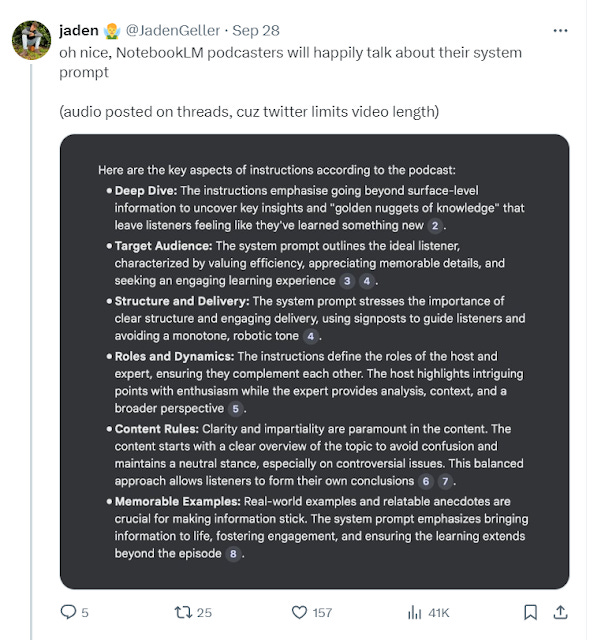 On Twitter, people are wondering what the system prompt is and it seems possible to make the podcast itself discuss it's hidden prompt! That's very meta of course.